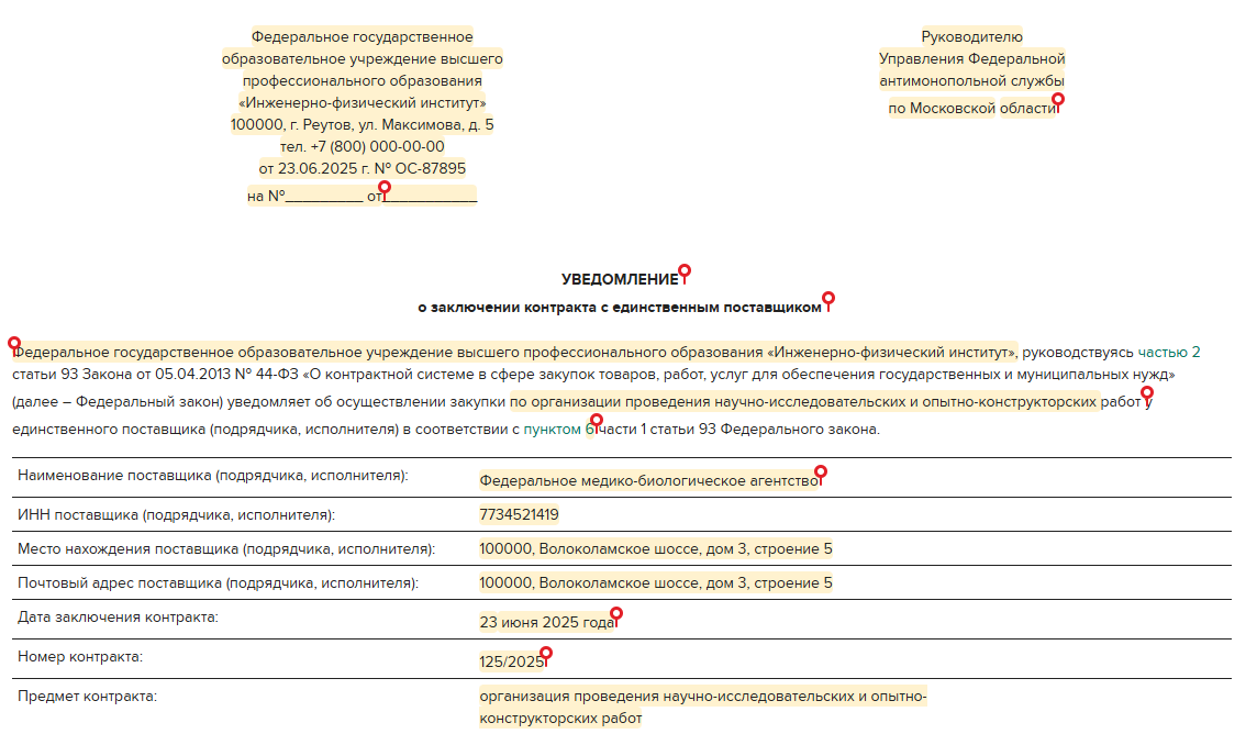 Образец Уведомления о заключении контракта с единственным поставщиком